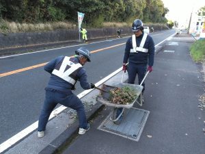 4月8日(水)、本社前からコインランドリーHOP様前までの清掃活動を行いました。 歩道や側溝にたまっている泥や落ち葉を綺麗に取り除き清掃を行いました。