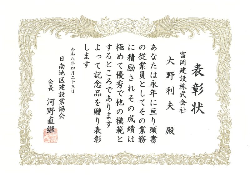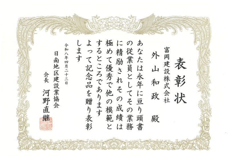 日南地区建設業協会より当社の外山和政、大野利夫の2名が優良従業員表彰を受けました。